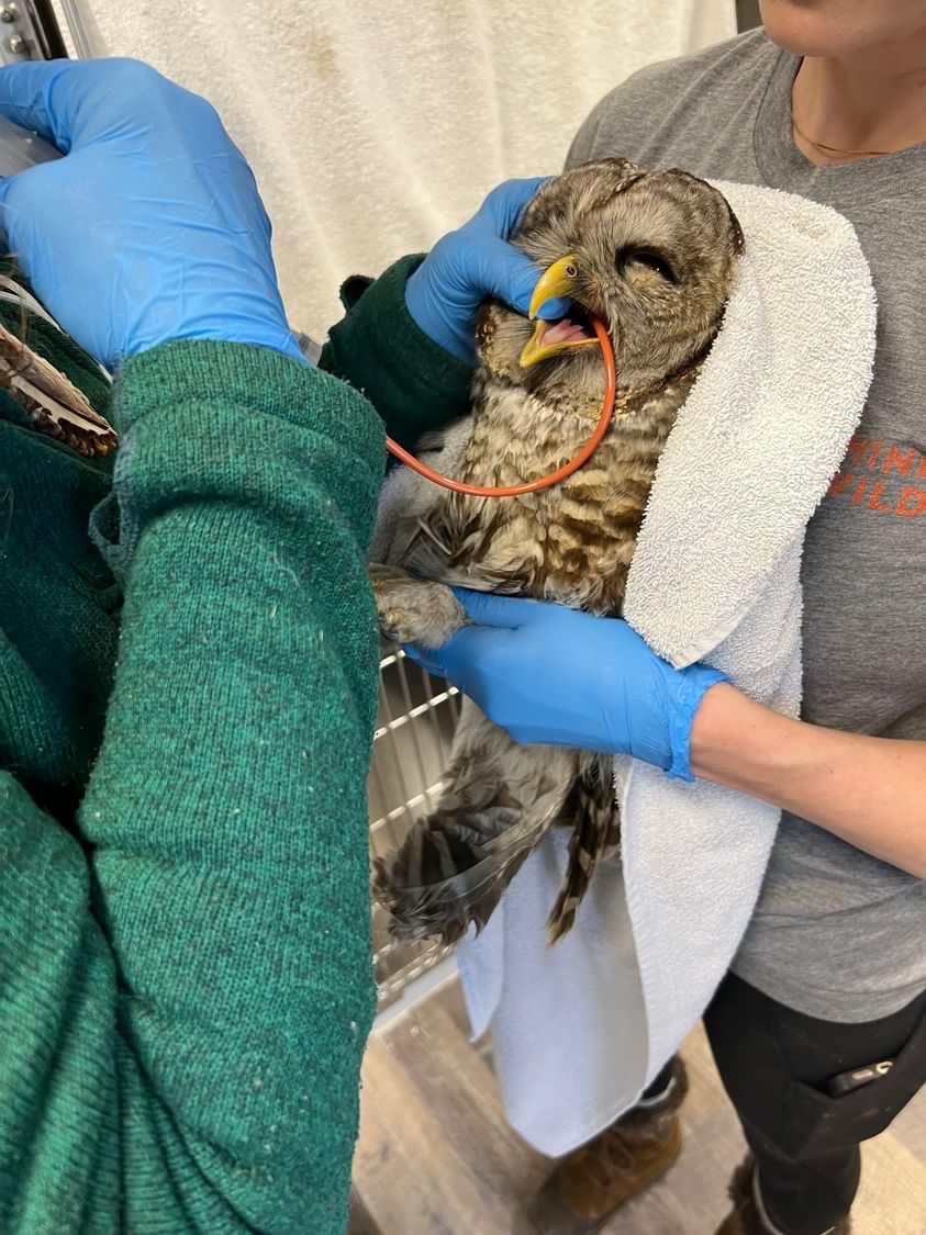 “Barred Owl 23-6 (our 6th patient of 2023) was brought to Think Wild on January 25 from Silver Lake, Oregon with a broken wing, possibly from being hit by a car. Staff determined it was a CMC (Carpometacarpal) fracture, basically the wrist bone of the right wing. We applied a wing wrap and treated the bruising and minor eye trauma. After three months in our care, this Barred Owl had recovered from his wing fracture and bruising, passed his live prey tests, and was released back to the wild in April 18.”