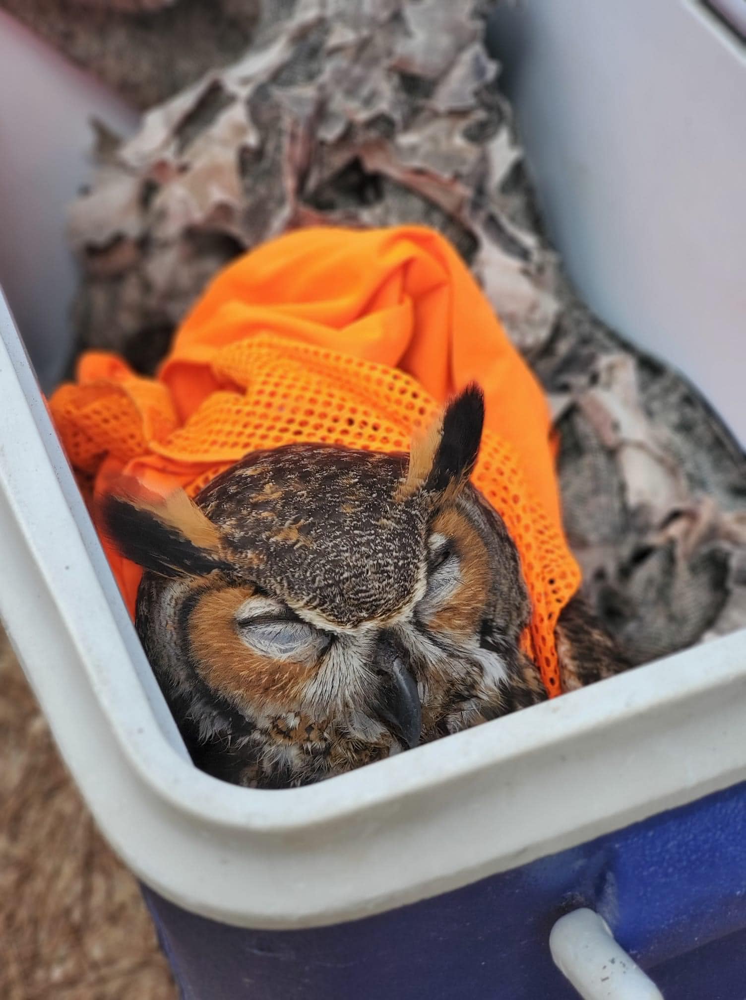 “This great horned owl found the end of Dec 2021 made a full recovery and was released back into his home territory (Sam Houston National Forest). We suspect he was suffering from some type of toxicity, but happily he responded to treatment. Once he felt better he spent about three weeks in a large flight enclosure to regain his strength.”