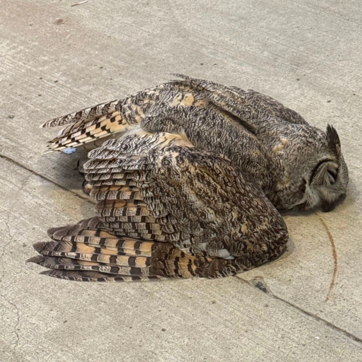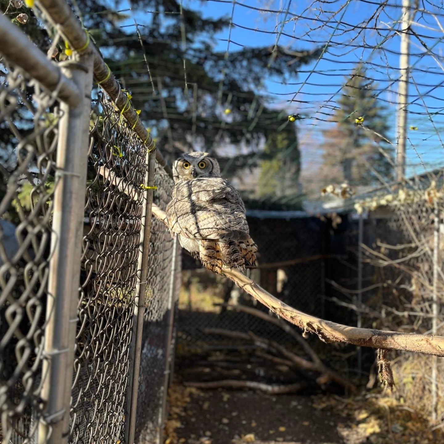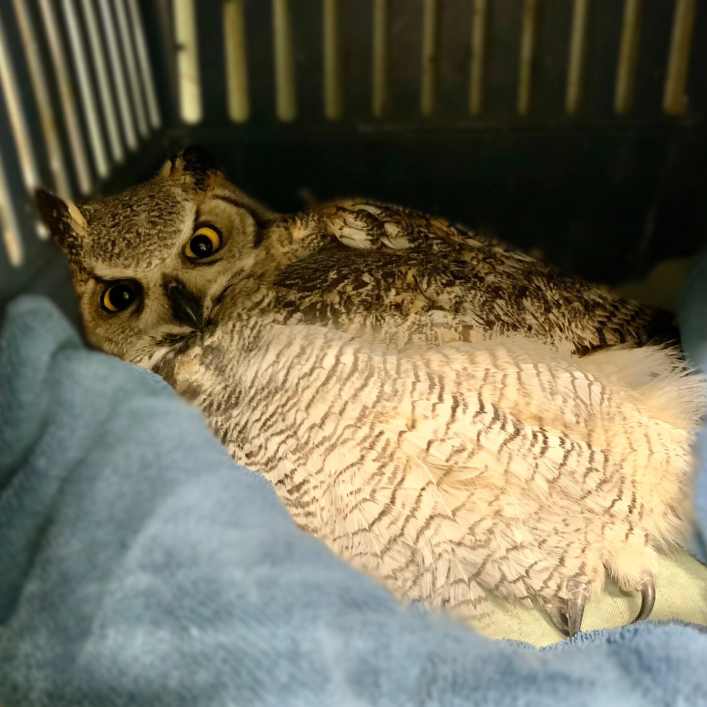 🪟🦉 This Great Horned Owl was admitted to our clinic after colliding with a window at the University of Regina. When it arrived, the owl was unconscious and suffering from severe head trauma. The injury was so significant that we had to administer anti-inflammatory and pain medication every 12 hours during the first week of care.