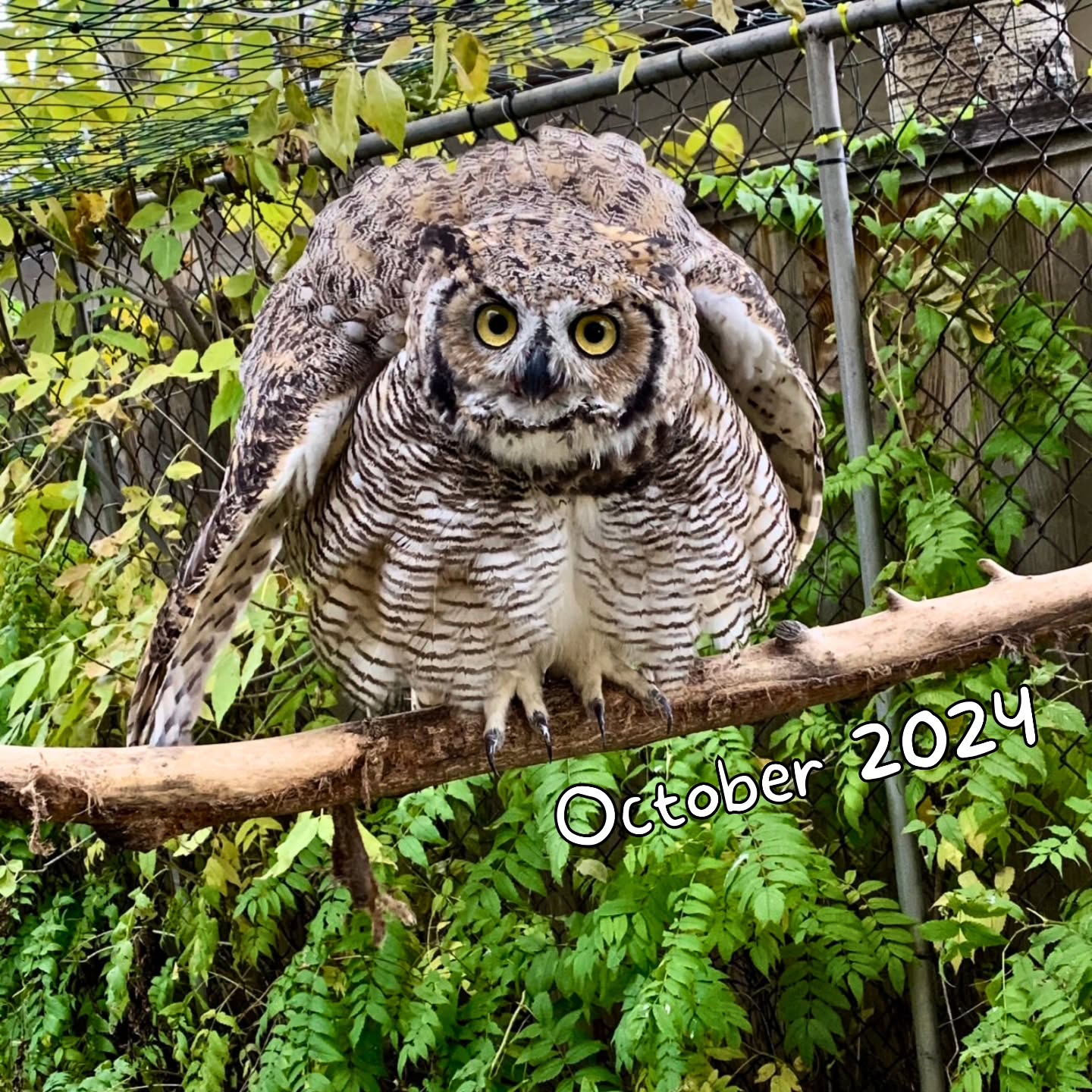 This Great Horned Owl’s defensive posture might look intimidating, but for us, it’s a big win! Remember the photo of her when she first came into our care? She couldn’t stand or even lift her head after suffering severe head trauma. It took weeks of medication, daily physiotherapy, and constant care for her to regain her strength and balance to stand. Now, not only does she perch confidently, she has regained her strong, powerful flight!