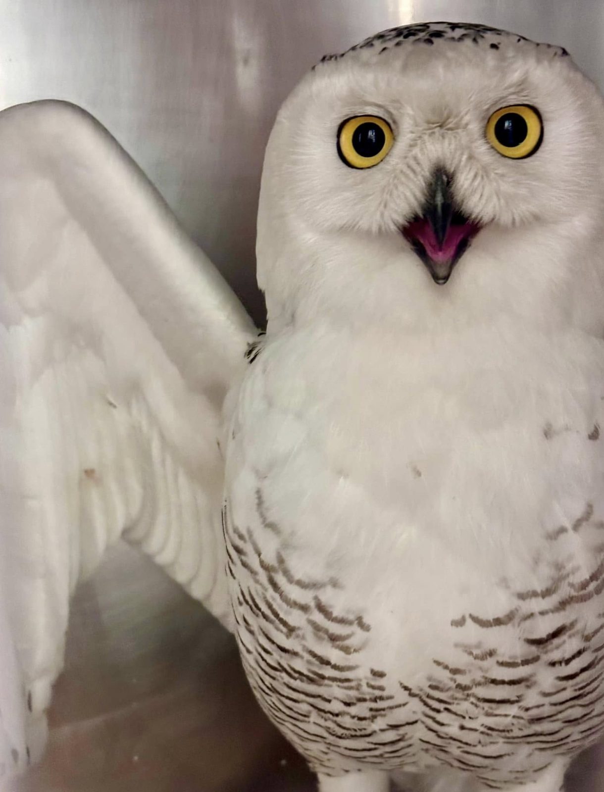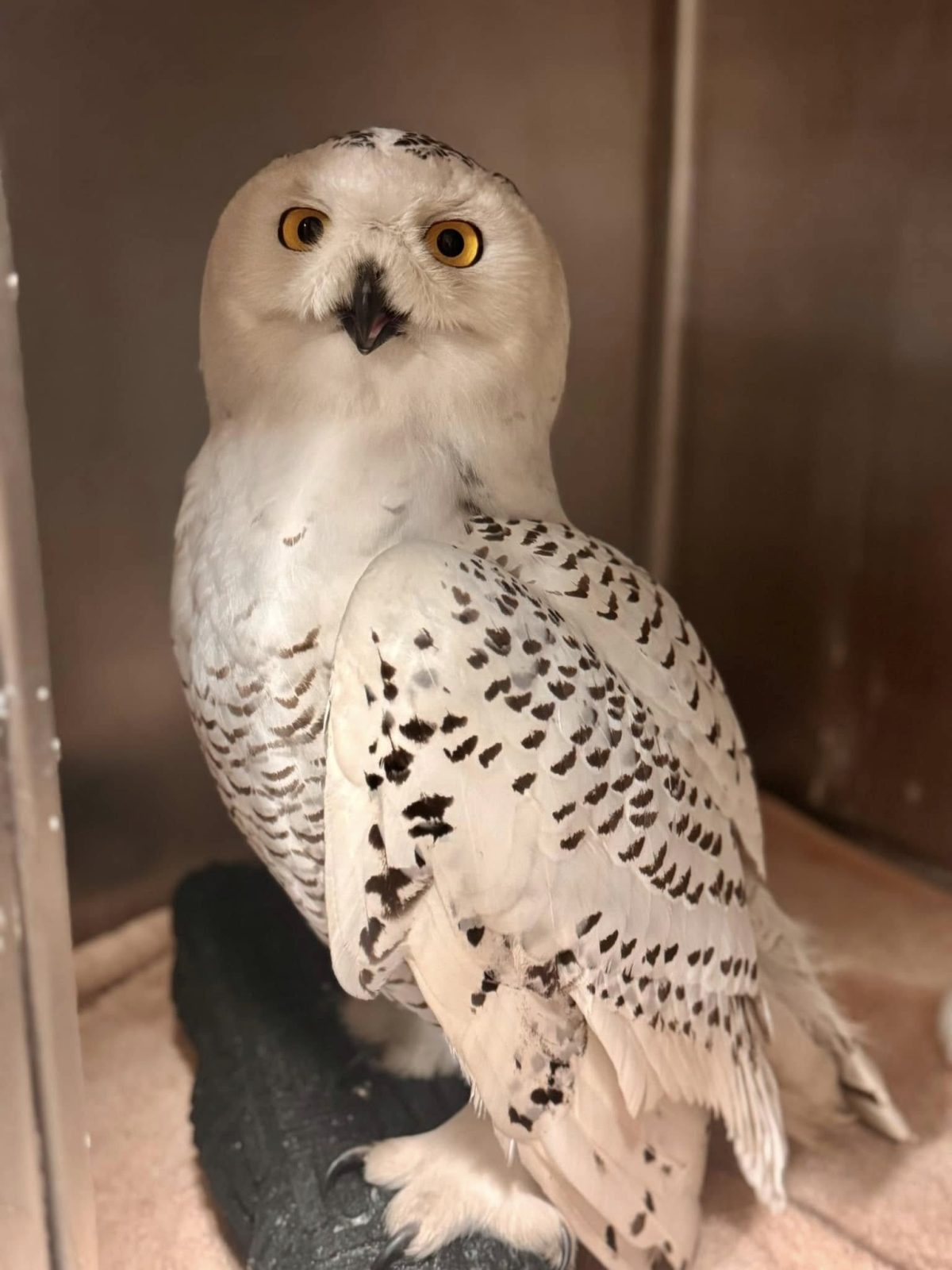 Snowy owls live in the arctic tundra most of the year and well equipped for that lifestyle. Dense and plentiful feathers insulate from head to talons. She has been perfectly comfortable with our temperatures, but not so much with her surroundings. These birds are not as used to human interaction and developed areas as our year-round owls are. The open areas around airports or even large parking lots resemble the habitat they know, making these attractive roosting spots. The snowy owls that fly south in search of food resources end up in areas with far more traffic (people and vehicles) that can expose them to potential dangers.